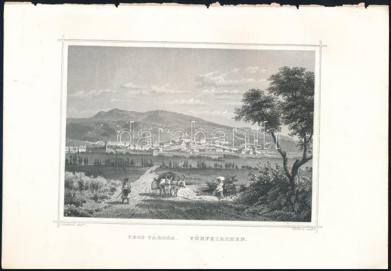 Leírás: Ludwig Rohbock (1820-1883) - G. M. Kurz: Pécs városa. Acélmetszet, papír, jelzett a metszeten. 12x18 cm.