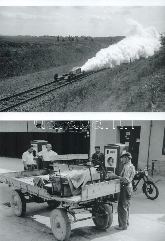 Különleges járművek: rakétával hajtott sínautó és motorral hajtott lovaskocsi, az utóbbi magyar buhera, eltérő időben készült felvételek, 2 db modern nagyítás, jelzés nélkül, 15x21 cm
