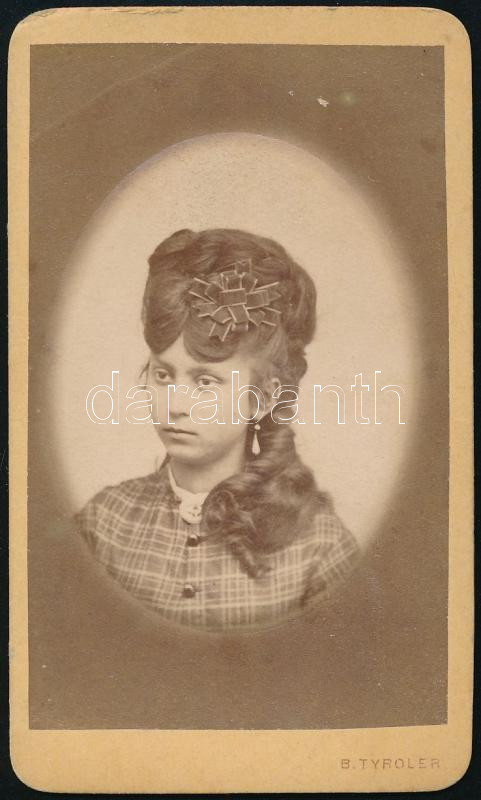 cca 1875-1880 Fiatal hölgy portréja, vizitkártya Tyroler Benjámin esztergomi műterméből (,,B. Tyroler fényirdája ir Esztergam"; Esztergom első állandó fényképészeti műterme), 10x6 cm