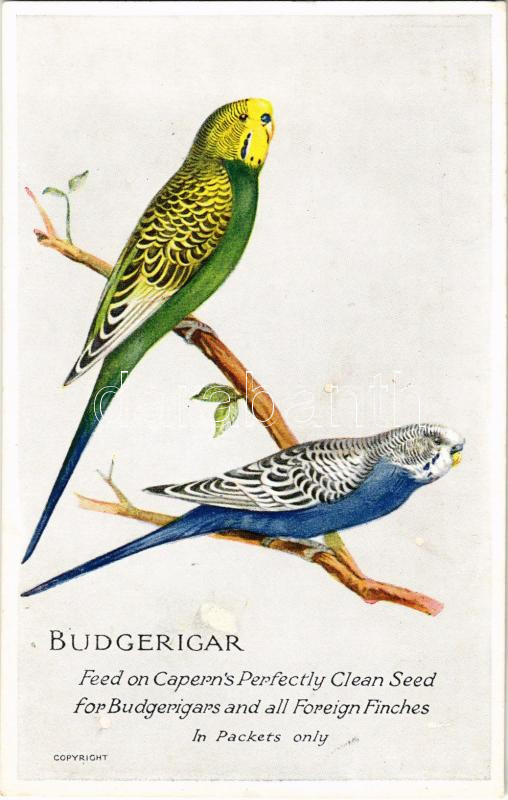 Leírás: Budgerigar. Feed on Capern's Perfectly Clean Seed for Budgerigars and all Foreign Finches. Capern's Perfectly Clean Bird Foods advertisement (felületi sérülés / surface damage)