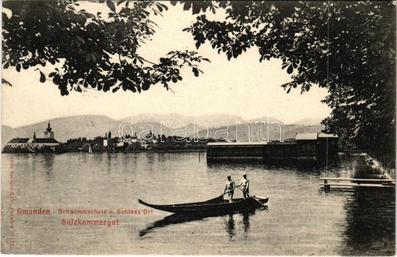 Leírás: 1906 Gmunden, Schwimmschule u. Schloss Ort / swimming school, castle (EK)