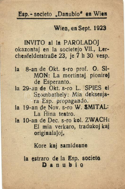 Esperanto postcard, Esperanto society 'Danubio' en Wien, inv... https://www.darabanth.com/hu/488-Gyorsarveres/488.0/Kepeslapok/Eszperanto~2500035/Esperanto-postcard-Esperanto-society-Danubio-en-Wien-invitation-EK~II975259