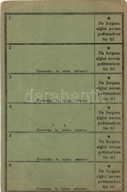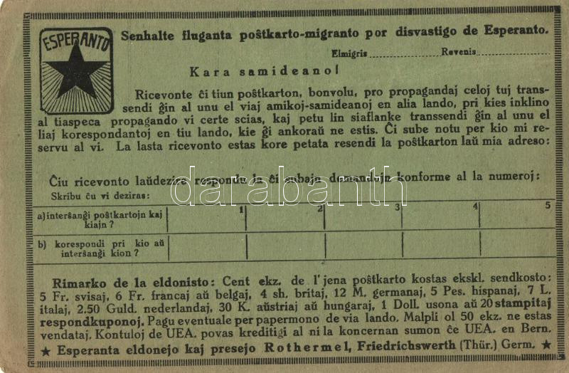 Leírás: Senhalte fluganta postkarto-migranto por disvastigo de Esperanto (fa)