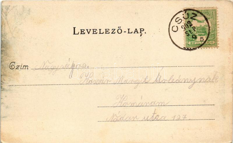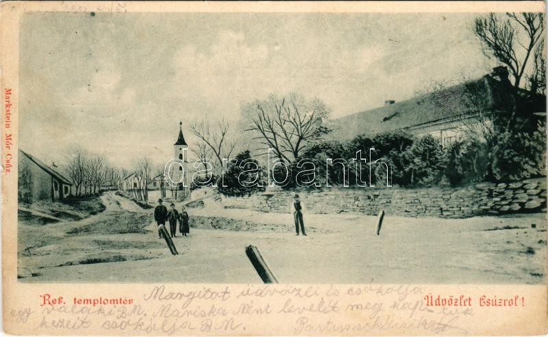 Leírás: 1902 Csúz, Cúz, Dubník; Református templom tér. Markstein Mór kiadása / Calvinist church, street (apró szakadás / tiny tear)