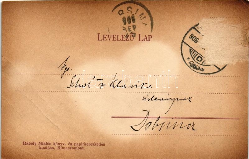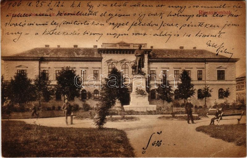 Leírás: 1906 Rimaszombat, Rimavská Sobota; Tompa szobor és a Kir. Törvényszék. Rábely Miklós kiadása / statue, court (Rb)