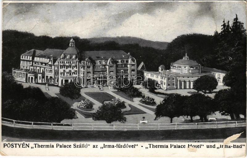 Leírás: 1912 Pöstyén, Piestany; Thermia szálló és Irma fürdő / hotel, bath, spa (felületi sérülés / surface damage)