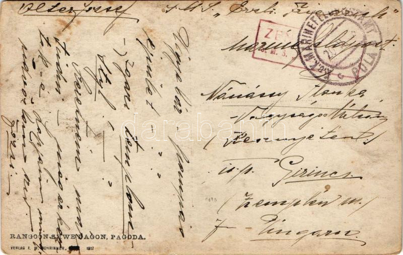 Leírás: 1918 Yangon, Rangoon; Shwedagon Pagoda. F.W. Schrinner 1917. + "K.u.k. Marinefeldpostamt" / Első világháborús osztrák-magyar haditengerészeti lap Burmából (fl)