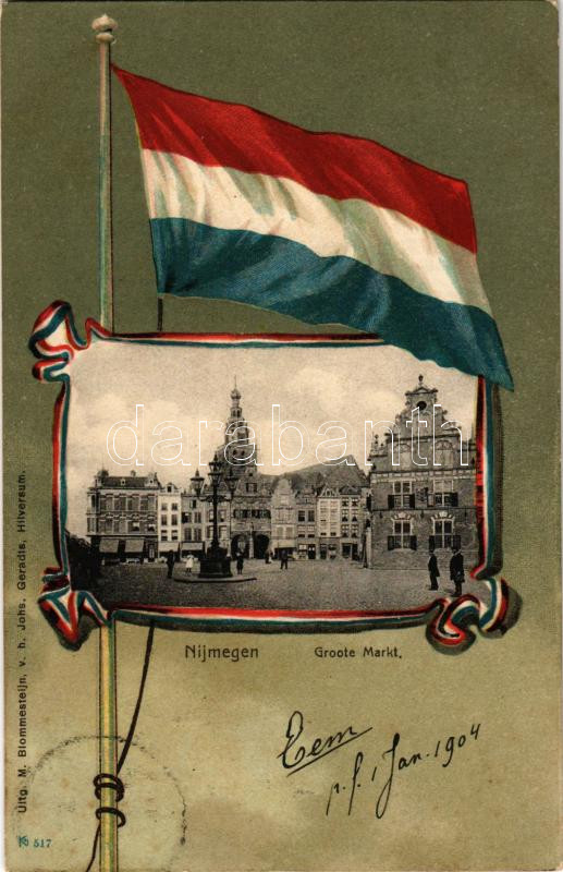Leírás: 1904 Nijmegen, Groote Markt. M. Blommesteljn v. h. Johs. Geradts Art Nouveau litho montage with Dutch flag (fl)