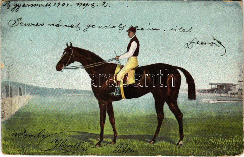1904 Zsoké / Jockey with horse (kopott sarkak / worn corners) https://www.darabanth.com/hu/488-Gyorsarveres/488.0/Kepeslapok/Lo~2500075/1904-Zsoke-Jockey-with-horse-kopott-sarkak-worn-corners~II3143238