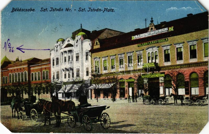 1936 Békéscsaba, Szent István tér, Polgári leányiskola, Haider Vilmos fényképészeti műterme, Aradi Ipar és Népbank fiókja. Gesmey Soma kiadása (levágott sarkak / cut corners)