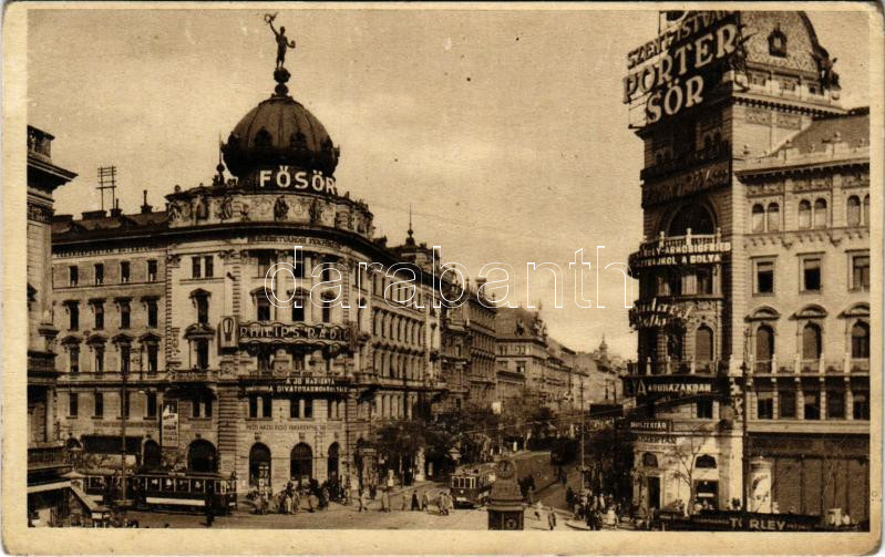 Budapest VII. Rákóczi út, Pesti Hazai Első Takarékpénztár Egyesület, Erzsébetvárosi Fiókpénztár, Fősör, Philips Rádió, Szent István Porter sör, Törley, gyógyszertár, áruház, üzletek, villamos. Weinstock felvétele (EK)