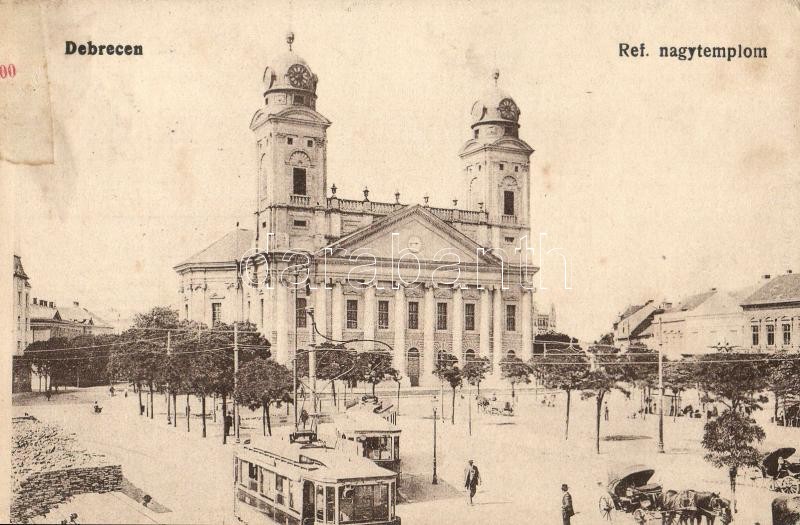 Debrecen, Református nagytemplom, villamosok https://www.darabanth.com/hu/488-Gyorsarveres/488.0/Kepeslapok/Magyarorszag~2500005/Debrecen-Reformatus-nagytemplom-villamosok~II1889692