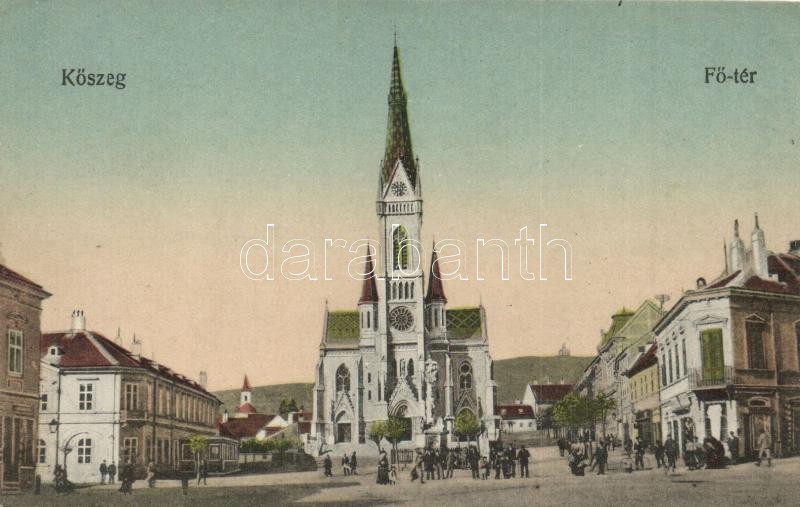 Leírás: Kőszeg, Fő tér, templom, üzletek. Róth Jenő kiadása (EK)