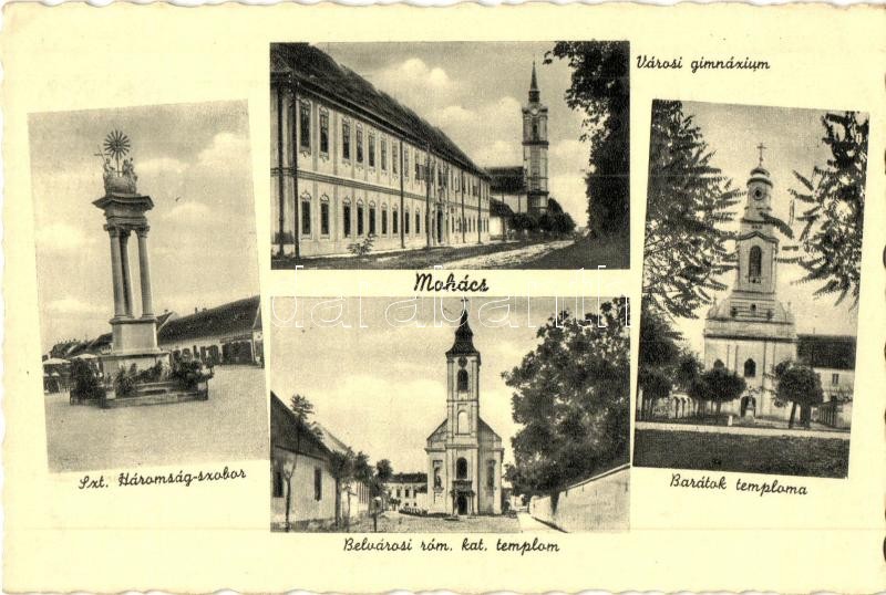 Leírás: Mohács, Városi gimnázium, Szentháromság szobor, Barátok és Római katolikus templom