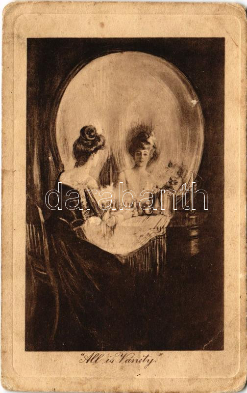 Minden csak hiúság. Hölgy koponyát formázó tükör előtt. Optikai illúziós képeslap / "All is Vanity" Lady in front of a skull-shaped mirror. Pictorial Comedy Postcards James Henderson & Sons, London. Optical illusion (szakadás / tear)