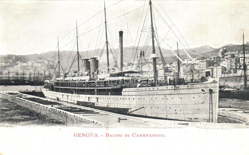 Genova, Bacini di Carenaggio / Dry docks with steamship https://www.darabanth.com/hu/488-Gyorsarveres/488.0/Kepeslapok/Olaszorszag~2500064/Genova-Bacini-di-Carenaggio-Dry-docks-with-steamship~II1743896