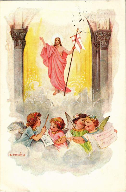 Leírás: 1939 Kegyelemteljes húsvéti ünnepeket kíván / Easter greeting art postcard with Jesus s: K. Sávely D. (kis szakadás / small tear)