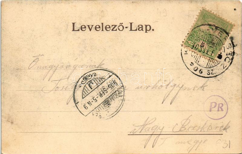 Leírás: 1905 Pancsova, Pancevo; Kiállítás, Halászcsárda. Pancsovai Népkonyha kiadása / Exhibition, restaurant + "KUBIN - VERSECZ 206. SZ." vasúti mozgóposta bélyegző (EM)