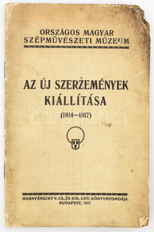 Leírás: Az új szerzemények kiállítása (1914-1917). Országos Magyar Szépművészeti Múzeum. Bp., 1917, Hornyánszky, papírkötés, foltos borító, hiányos sarokkal.