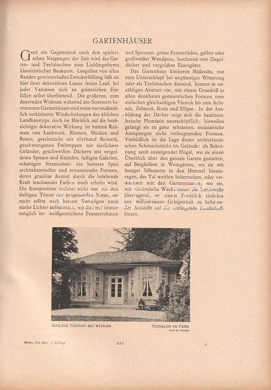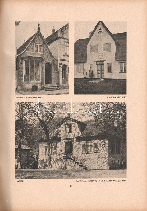 Mebes, Paul (herausg.): Um 1800. Architektur und Handwerk im letzten Jahrhundert ihrer traditionellen Entwickung. Herausgegeben von Paul Mebes. Bearbeitet von Walter Curt Behrendt. München, 1920. Druck und Verlag F. Bruchmann AG. XV + [1] + 307 + [1] p. Első kiadás. Építészeti és iparművészeti albumunk a német építészet, városépítészet és lakáskultúra 1800 körüli történetét vizsgálja. A képanyag döntő része a szigorú homlokzatrendet apró ívekkel oldó északi klasszicizmus épületeit mutatja be, Hamburg, Koppenhága, Potsdam, Berlin, Danzig városaiból vett példákkal. Szerepelnek itt ugyan a középkori építészeti hagyományokat idéző, kis alapterületű városi magánházak is, és a Hanza-városok keskeny portálú, magasba törő északi barokkja is felvonul a kötetben, de a munka nagyját az 1800 körül uralkodó stílus, a klasszicizmus építészeti rendje képviseli, mely kétemeletes bérházaiban a pesti belváros legrégebbi utcáira emlékeztet, négyemeletes bérházaiban azonban már a német klasszicista architektúra műszaki áttöréseit jelzi. A klasszicista városi bérház-, templom-, kórházépítészet példáin kívül a korabeli városi közterek kialakítását is illusztrálja a munka, valamint elidőz a késő barokkot klasszicizmussal vegyítő kastély- és kúriaépítészet részletein is. A munka végén válogatás a klasszicista belsőépítészet megoldásaiból. Feliratozott, sérült, javított gerincű kiadói félvászon kötésben (Tobias Schwab, Berlin).