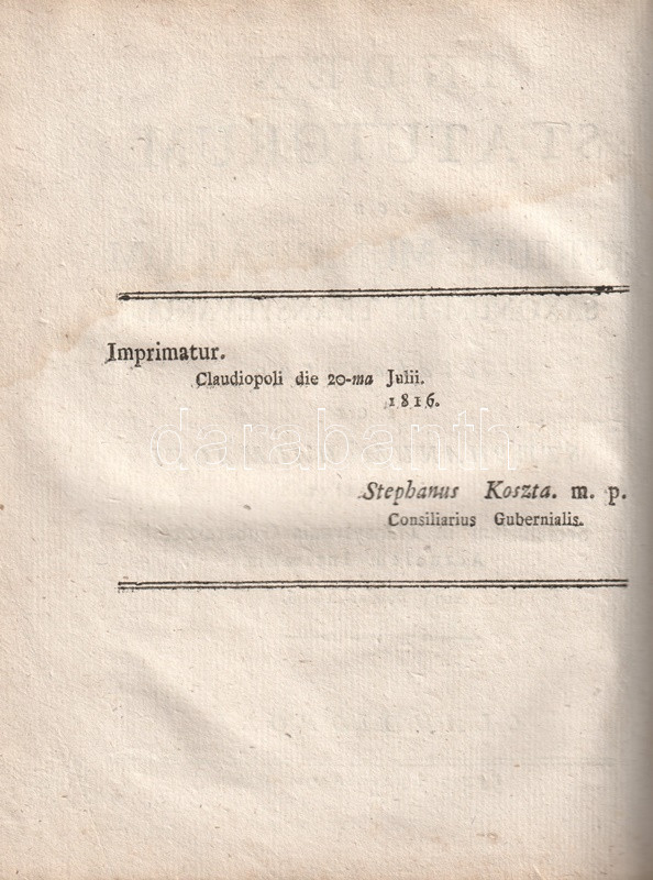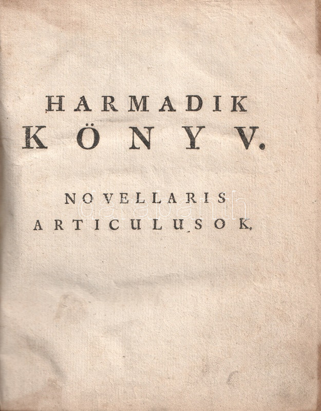 Halmágyi [István], Stephanus (szerk.): [Erdély országának Három Könyvekre osztatott törvényes könyve] Harmadik könyv: Novellaris articulusok. -- Index novellarium articulorim diaetalium. Ab Anno 1744. usque Annum 1792 Conditorum elaboratus Opera et Studio Stephani Halmágyi de Étfalva. [Kolozsvár] (Claudiopoli, 1816. Typis Lycei Regii.) [2] + 256 + [94] p. Hozzákötve: ---- Fronius, Matthius -- Halmágyi, [István] Stephanus (szerk.): Statuta jurium municipalium Saxonum in Transylvania: Opera Matthiae Fronii revisa, locupleta & edita. Denuo ad exemplar Coronense Anni 1583. -- Index statutorum seu Jurium municipalium Sexonum in Transylvania. Elaboratus per Stephanum Halmágyi de Étfalva. Anno Domini 1816. [Kolozsvár] Claudiopoli, 1815-1816. Typis Lyceii Regii. [16] + 61 + [3] p.;[70] p. Latin nyelvű jogi kolligátumunk Erdély jogrendjét szabályozza. Első részét Halmágyi István (1719-1785) valóságos titkos tanácsos, háromszéki főispán szerkesztette. A munka az 1744-1792 közötti időszak erdélyi országgyűlésein hozott törvénycikkeket adja közre, elsőként folyószövegben, majd az általa szerkesztett tartalommutató szerint. A hozzákötött munka Fronius Mátyás (1522-1588) brassói városkapitány műve. Az 1583-ban keletkezett munka, azóta többször kiadott munka az erdélyi szászokra vonatkozó törvényeket gyűjti össze. A régi szász jogi szabályozáshoz szintén Halmágyi István készítette az alapos tárgymutatót. Oldalszámozáson belül néhány fametszetű fejléccel, néhány oldalon széljegyzetek, aláhúzások. Fronius Márton művének és a hozzá tartozó tartalomjegyzék oldalain foltosság. Két levélen apró pótlás. Aranyozott, enyhén hiányos gerincű, enyhén kopott korabeli félvászon kötésben.