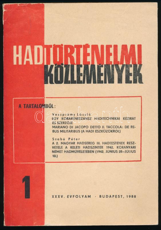 1988 Hadtörténeti Közlemények XXXV. évf. 1. sz. Szerk.: Csákváry Ferenc. Bp., 1988, Zrínyi Katonai Könyv- és Lapkiadó, 241+(1) p. A tartalomból: Veszprémy László: Egy korareneszánsz haditechnikai kézirat és szerzője. Szabó Péter: A 2. magyar hadsereg III. hadtestének részvétele a keleti hadszíntér 1942. koranyári német hadműveletében. (1942. június 28-július 10.) Szövegközti és egészoldalas fekete-fehér képekkel. Kiadói papírkötés, a gerincen kisebb sérülésekkel.