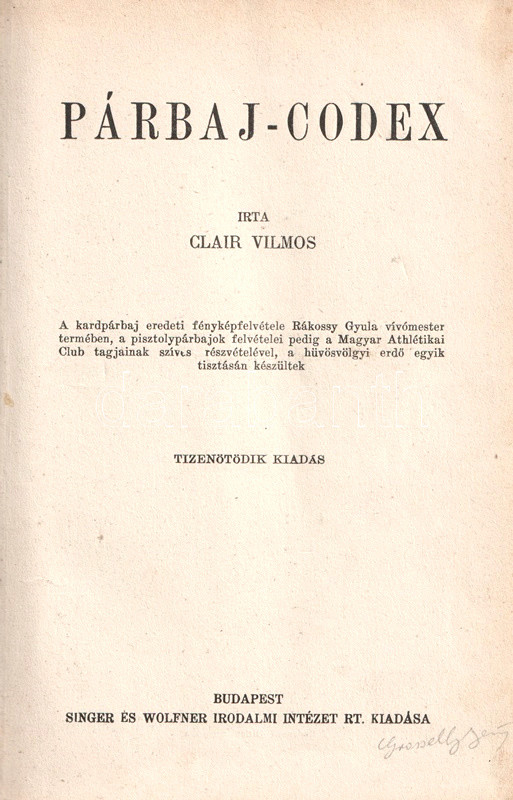 Clair Vilmos: Párbaj-codex. Budapest, [1928]. Singer és Wolfner Irodalmi Intézet Rt. [4] + 135 + [1] p. + 3 t. Clair Vilmos (1858-1951) jogász, újságíró, párbajszakértő, a téma alapvető szakmunkájának szerzője. A becsületet ért sérelmet helyreállító, illegális párbajozás szokását a szerző erősen helyteleníti, erre az előszóban fel is hívja a figyelmet, a vívott és lőfegyveres párbajozás körülményeit pedig pont azért szabályozza igen körültekintően, hogy a párbajokban minél kevesebb sérülés essék. A mű első kiadása 1897-ben jelent meg, példányunk a munka 15., javított, bővített kiadásából származik. Az első ív fűzése a gerincnél megerősítve, az első nyomtatott oldalon és a címoldalon régi tulajdonosi bejegyzés. Aranyozott gerincű korabeli félvászon kötésben, az első, illusztrált kiadói borító bekötve. Jó példány.