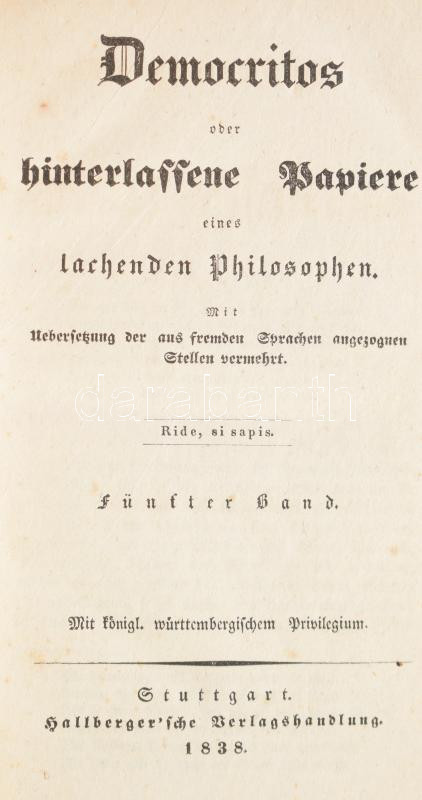 Democritos oder hinterlassene Papiere eines lachenden Philosophen nebst einem Fragment aus des Verfassers Leben, und durch Uebersetzung der aus fremden Sprachen angezogenen Stellen vermehrt. Carl Julius Weber`s sämmtliche Werke sechzehnter bis fünfundzwanzigster Band 12 Bände Teljes sorozat!