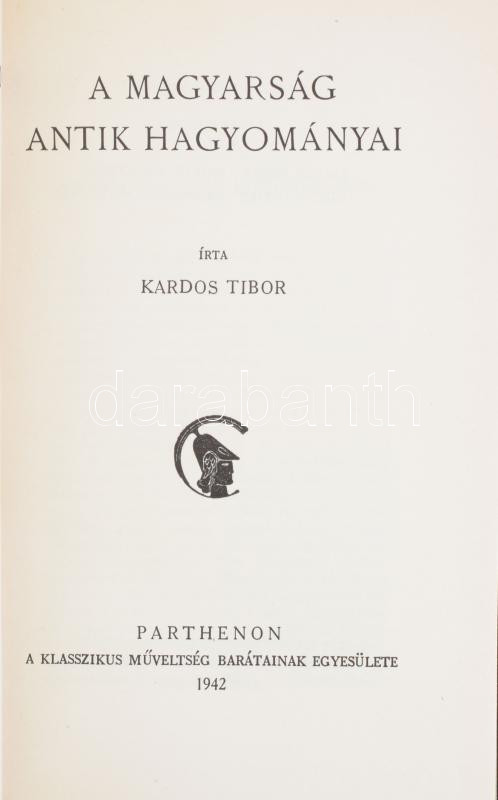Kardos Tibor: A magyarság antik hagyományai. Pantheon-Tanulmányai 5. Bp., 1942, Pantheon-Franklin, 93+3 p. Kiadói egészvászon-kötés, kissé kopott borítóval.
