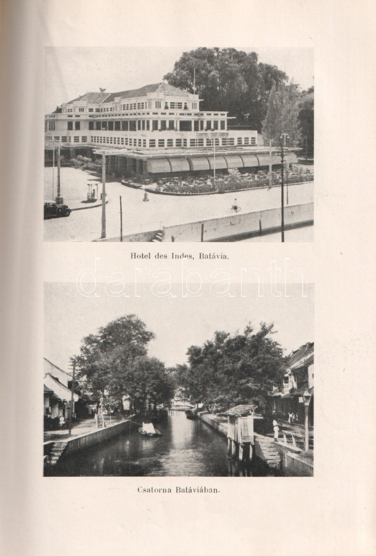 Keöpe Viktor: A szigetek gyöngye. 53 képpel és 2 térképpel. Budapest, (1936). Franklin-Társulat Magyar Irodalmi Intézet és Könyvnyomda. 189 + [3] p. + 20 t. (kétoldalas) + 2 térkép (egy egész oldalas, egy kihajtható). Egyetlen kiadás. Keöpe Viktor (1883-1970) utazó, geográfus, földrajzi író úti beszámolója a holland adminisztráció alatt álló Jáva szigetéről, a sziget klímájáról, domborzatáról, vulkanizmusáról, növénytakarójáról, helyi kultúrájáról és gyarmati közigazgatásáról. Színes néprajzi részletekben gazdag beszámolója markánsan európai nézőpontot rögzít: "A jávai kellemes modorú, engedelmes, alázatos nép, látszik, hogy már nagyon megszokta a szolgaságot. Ha nem a hollandiak volnának uraik, akkor valamelyik bennszülött zsarnokoskodnék rajtuk, s ez még sokkal rosszabb volna. Különben élénkek, vidámak, a holnappal édeskeveset törődnek, azt sem tudják, hány évesek. Olyanok, mint a gyermekek; a hollandi kormány úgy is bánik velük. Hagyják, hogy a saját fajuk vezesse, de az ő irányításuk mellett. A nép imádja az ünnepségeket: a rizsaratás ünnepe, házassági ünnepségek, tűzijátékok, gamelang, táncok... s ha mindez megvan, boldog is." Az előszó oldalán régi ajándékozási bejegyzés. (A Magyar Földrajzi Társaság Könyvtára.) Díszesen aranyozott kiadói egészvászon kötésben. Jó példány.