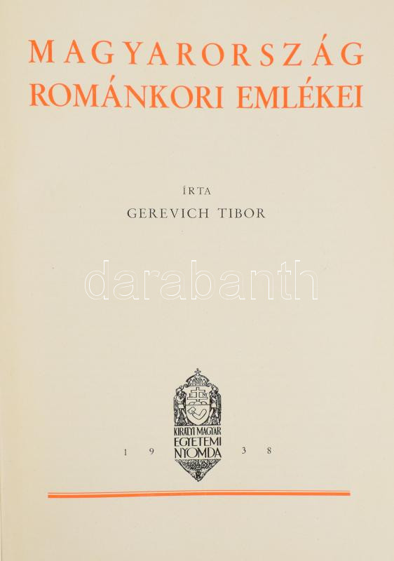 Magyarország művészeti emlékei I. kötet: Gerevich Tibor: Magyarország románkori emlékei. Magyarország művészeti emlékei I. köt. Bp., 1938, Műemlékek Országos Bizottsága - Kir. M. Egyetemi Nyomda, 842+1 p.+2 (kihajtható tábla, közte 1 térkép vázlat) t. A 277-808 oldalak között, I-től CCLXIV-ig számozott fekete-fehér képtáblával.
