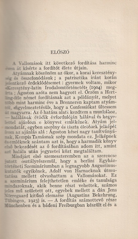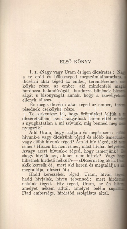 Szent Ágoston: Szent Ágoston vallomásai. Fordította és magyarázta Balogh József. I-II. kötet. [Teljes, két kötetben.] [Budapest], 1944. Parthenon - Franklin-Társulat Magyar Irodalmi Intézet és Könyvnyomda. 1 t. (címkép) + XLI + [1] + 211 + [3] p.; 350 + [2] p. Balogh József (1893-1944) klasszika-filológus, műfordító, szerkesztő, irodalomtörténész. Főként ókeresztény irodalommal foglalkozott. Műfordítása először 1943-ban jelent meg, két kötetben, példányunk a második, javított kiadásból származik. A címlapokon régi tulajdonosi bejegyzés. (A Parthenon kétnyelvű klasszikusai.) Egységes, aranyozott kiadói egészvászon kötésben, egységes, színes, illusztrált, enyhén hiányos kiadói védőborítóban. Jó példány.
