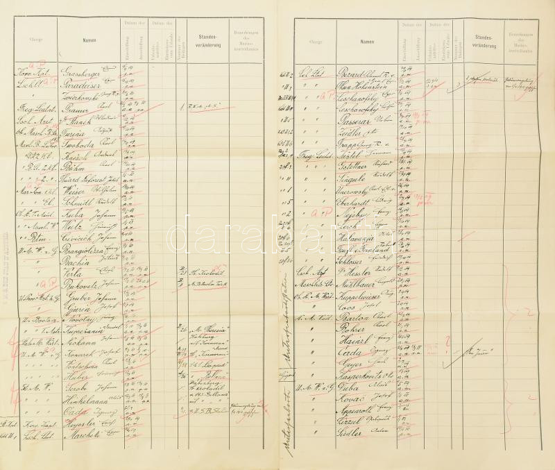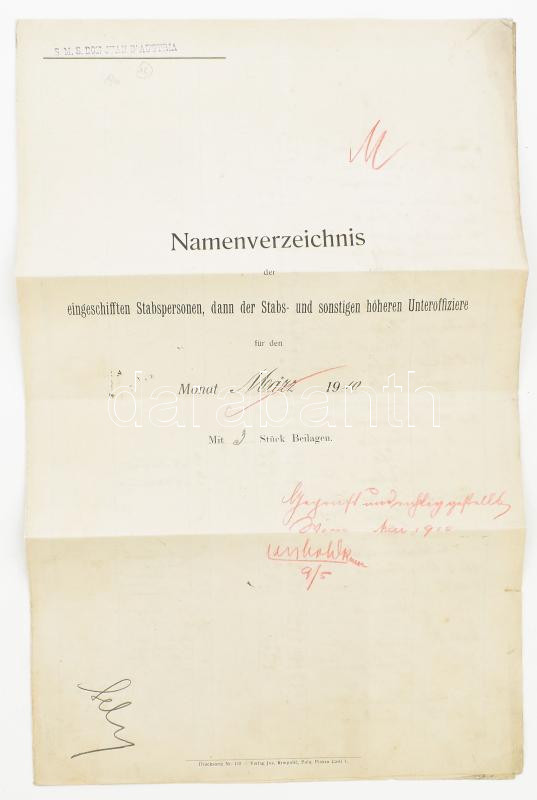 1910 Az S.M.S. Don Juan D'Austria kimutatása az 1910 márciusában fedélzetre lépett személyekről. A parancsnok aláírásával és a hajó pecsétjével, alul részletezve a személyek / List of names of the staff members, then the staff and other high non-commissioned officers who came on board of S.M.S. Don Juan D'Austria in the month of March 1910 Page two lists the following officers who were serving on or visited S.M.S. Don Juan d'Austria during the month: Korvettenkapitän Edmund Grassberger (born in 1865, gazetted Korvettenkapitän on May 1, 1907; Kontreadmiral (rear admiral) May 5, 1917 Linienschiffsleutnant Egon Paradeiser (born in 1877, gazetted Linienschiffsleutnant on November 1, 1906; Korvettenkapitän May 1, 1915) Fregattenleutnant Karl Pramer (born in 1884, gazetted Fregattenleutnant on January 1, 1909; Linienschiffsleutnant May 1, 1913) Linienschiffsarzt Vladimir Stanék (gazetted provisional Fregattenarzt on January 10, 1908; not found in the 1917 Rangliste)