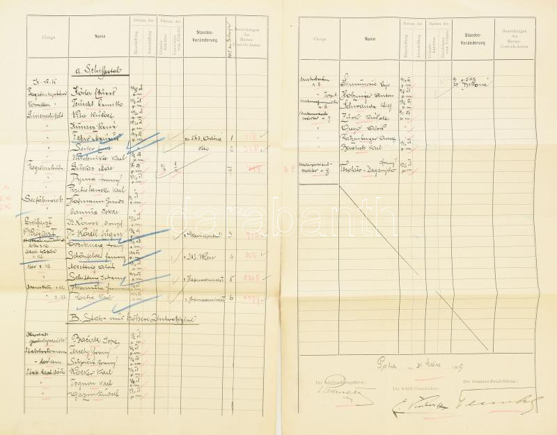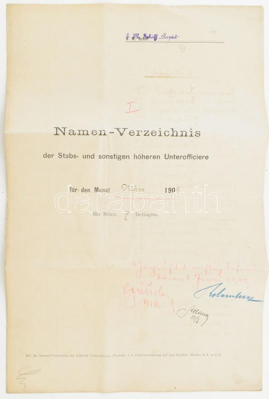 1913. Az S.M.S. Árpád osztrák-magyar hadihajó kimutatása a fedélzetre lépett magas rangú tisztekről. A parancsnok aláírásával és a hajó pecsétjével, részletezve a személyekkel /Namenverzeichnis for the month of March 1909. Four-page document signed in Pola on March 31, 1909. The following officers are listed as being or having come on board during the month: Seal: S. M. Schiff árpád Kalis/Kohl No. 3 [type DL 1a] violet Korvettenkapitän Eduard Körber (gazetted Fregattenkapitän on May 1, 1906; not found in the 1917 Rangliste) Korvettenkapitän Camillo Teuschl (gazetted Korvettenkapitän on November 1, 1907; Linienschiffskapitän January 30, 1917) Linienschiffleutnant Rudolf Vita (gazetted Linienschiffsleutnant on January 1, 1900; Korvettenkapitän in Marinelokalanstelung May 1, 194) Linienschiffleutnant Rene Kunasz (gazetted Linienschiffsleutnant on November 1, 1902; not found in 1917 Rangliste) Linienschiffleutnant Maurus Fabro (born in 1876, gazetted Linienschiffsleutnant on May 1, 1907; Korvettenkapitän on May 1, 1916) Linienschiffleutnant Josef Seiler (born in 1876, gazetted Linienschiffsleutnant on November 1, 1907; Korvettenkapitän on August 1, 1917) Linienschiffleutnant Karl Kuchnika (born in 1877, gazetted Linienschiffsleutnant on November 1, 1907) Fregattenleutnant Max Lukas (born in 1879, gazetted Fregattenleutnant on May 1. 1905; Linienschiffsleutnant May 1, 1910) Fregattenleutnant Franz Dyrna (born in 1881, gazetted Fregattenleutnant November 1, 1906; gazetted Linienschiffsleutnant on May 1, 1911) Fregattenleutnant Karl Przibislawsky (born in 1895, gazetted Fregattenleutnant on January 1, 1909; Linienschiffsleutnant May 1, 1913) Seefähnrich Guido Hoffmann (born in 1885, gazetted Linienschiffsleutnant on May 1, 1913) Seefähnrich Oskar Camus (gazetted Seefähnrich on July 1, 1907; not found in the 1917 Rangliste) Linienschiffsarzt Dionysius Nowak (born in 1876, joined service of January 4, 1897, gazetted Linienschiffsarzt on November 1, 1917) Fregattenarzt pr. Dr. Eugen Worell (gazetted provisional Fregattenarzt on November 11, 1908)