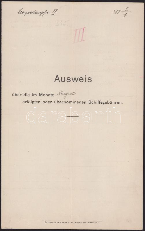 1914 S.M. Dampfer IX (ex Baron Call) osztrák magyar szállító hadihajó Az augusztus hónapban felmerült vagy kifizetett hajózási költségek bizonylata. Kézzel írt ritka hajópecséttel. / S.M. Dampfer IX (ex Baron Call) / Proof of Ship Expenses Incurred or Paid in the Month of August. Very rare, possibly unique document evidencing amounts paid to three different individuals between July 28 and August 31, presumably in 1914, the only month when Baron Call was requisitioned by the k.u.k. Kriegsmarine as S.M. Dampfer IX. The names include that of Nikolaus Cosulich, probably a member of the well-known Trieste shipping family that owned the Austro-Americana shipping line company. The document's left and right margins appear to have been clipped and, unfortunately, its full date and the name of the commanding officer are missing, but the signature of the ship's accounting manager is fully legible.
