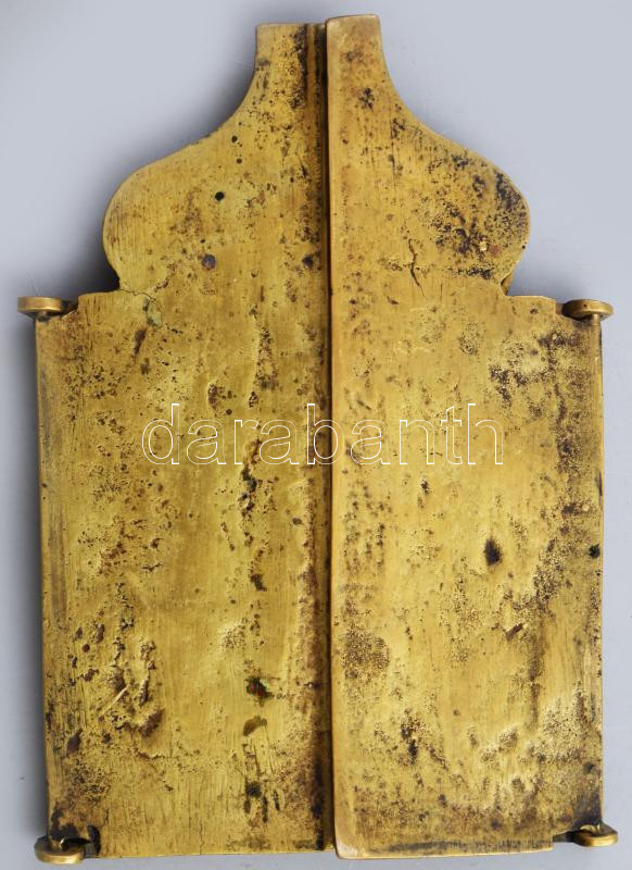 Triptichon - Kazanyi Istenszülő szentekkel. Bal szárnyon: Gábor arkangyal, Harcos Szent János őrangyal, középen: Kazanyi Istenszülő, jobb szárnyon: Szviri Szent Alekszandr, Radonyezsi Szent Szergij. Bronz, orosz, cca 19. sz. közepe, egy helyen lyukasztott, 12,5x17 cm