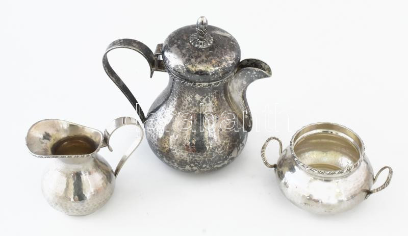 Leírás: WMF art deco kalapált mintás háromrészes szervírozó szett, cukortartó fedele hiányzik, jelzett, kopott, m: 19 cm alatt