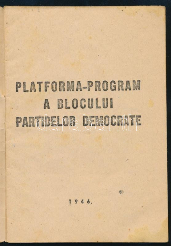 1944 Platforma - Program A Blocului Partidelor Democrate. Román kommunisták választási programja. 30p. Papírborítóval, hátulján firkákkal. Nagyon ritka Romanian communists election program. 30p. With paper cover, scribbles on the back. Very rare