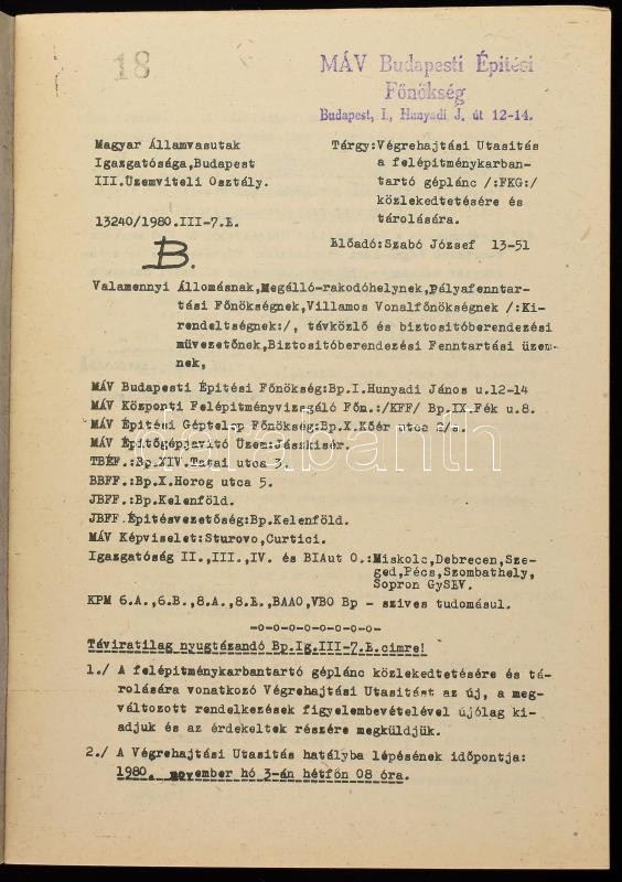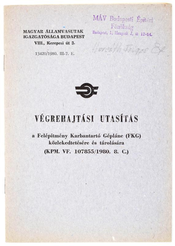 1980 Magyar Államvasutak Igazgatósága - Végrehajtási utasítás a Felépítmény Karbantartó Géplánc (FKG) közlekedtetésére és tárolására. Kiadói tűzött papírkötés, (2)+22 p.