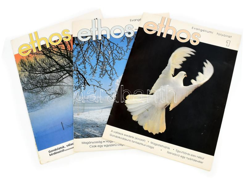 Leírás: cca 1991-1992 Ethos evangéliumi folyóirat 3 db száma (1. és 2. sz. + különkiadás), változó állapotban