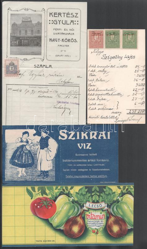 Leírás: cca 1900 -1930 Számla (Nagykőrös Kertész Gyula, Budapest Spriegel József aranyműves) és két ásványvíz és konzerv címke.