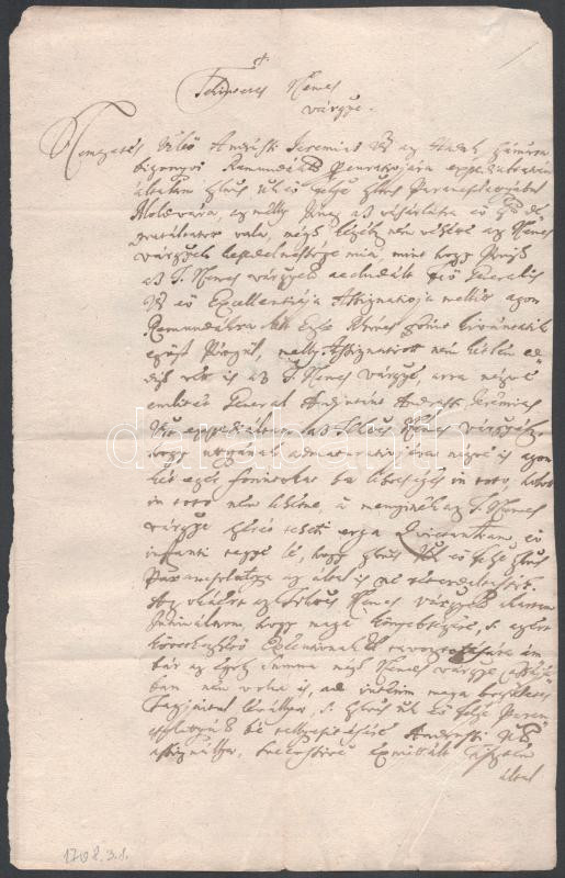 Leírás: 1708 magyar nyelven írt levél Rákóczi korából magyar-latin vegyes nyelven vízjeles papíron Rákóczi Assignatioja ügyében