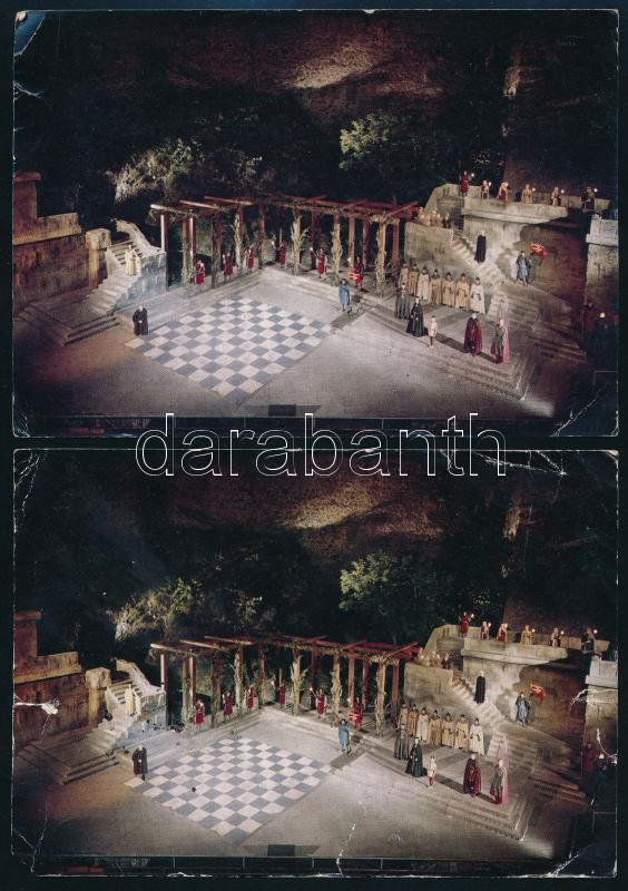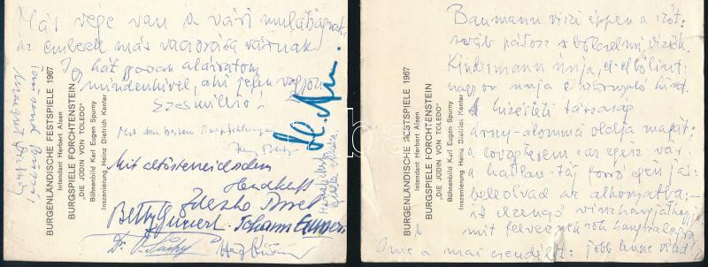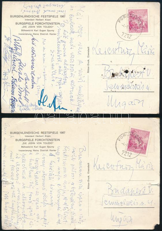 1967 Keresztury Dezső (1904-1996) költő, korábbi vallás- és közoktatásügyi miniszter autográf verses sorai felesége, Mária részére, Herbert Alsen (1906-1978) német-osztrák operaénekes, intendáns, Margret Dietrich (1920-2004) német-osztrák színigazgató és mások beazonosítandó autográf aláírásaival, burgenlandi fraknói ünnepi játékok képeslap hátoldalán. + egy további képeslap Keresztury Dezső (1904-1996) költő, korábbi vallás- és közoktatásügyi miniszter autográf verses soraival, szakadásokkal