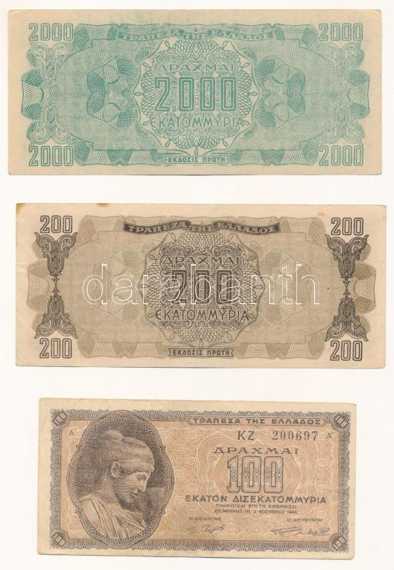 Leírás: Görögország 1944. 200.000000Dr + 2.000.000.000Dr + 100.000.000.000Dr T:F közte szép papírt Greece 1944. 200.000.000 Drachmai + 2.000.000.000 Drachmai + 100.000.000.000 Drachmai C:VG with nice paper