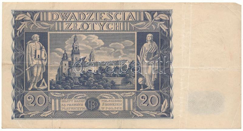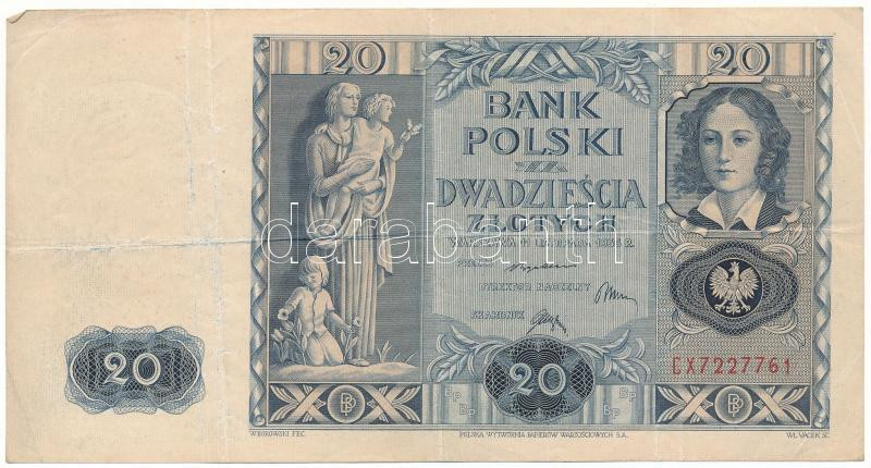 Poland 1936. 20 Z... https://www.darabanth.com/hu/488-Gyorsarveres/488.0/Numizmatika/Kulfoldi-bankjegyek~500015/Lengyelorszag-1936-20Zl-CX-7227761-TF3Cbr-3E-Poland-1936-20-Zlotych-CX-7227761-CF~II3273904