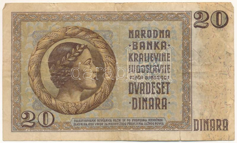 Montenegró / Olasz megszállás 1936. (1941) 20D "VERIFICATO" bélyegzéssel T:F,VG Montenegro / Italian occupation 1936. (1941) 20 Dinara with "VERIFICATO" overprint C:F,VG Krause P# R11
