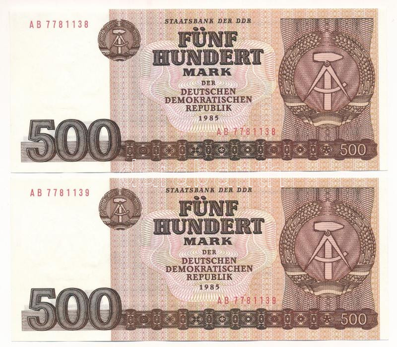 GDR 1985. 500 Mark (2x) unissued, consecutive serials "AB 7781138 - AB 7781139" C:AU