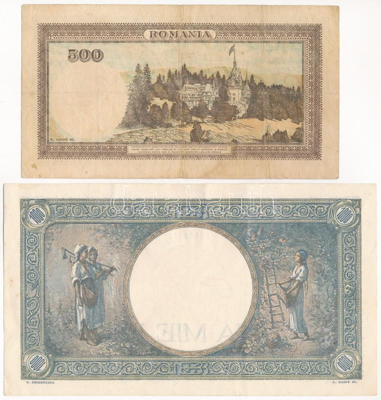 Románia 1941. 1000L "M.0487 12162231" + 500L "B/10 0059... https://www.darabanth.com/hu/488-Gyorsarveres/488.0/Numizmatika/Kulfoldi-bankjegyek~500015/Romania-1941-1000L-M0487-12162231-plus-500L-B10-0059629-TF--Romania-1941-1000-Lei-M0487-12~II3329192