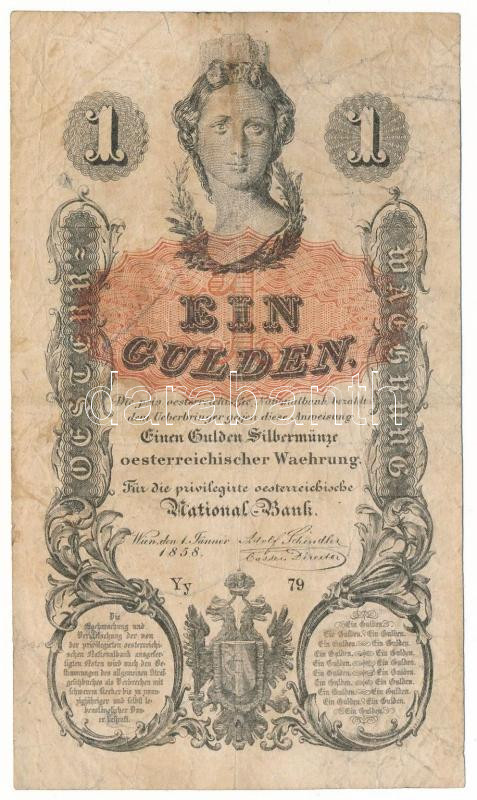 Leírás: 1858. 1G vízjeles papíron T:VG foltos, szakadás Austrian Empire 1858. 1 Gulden with watermark C:VG spotted, tear Kodnar 91a, Adamo G87