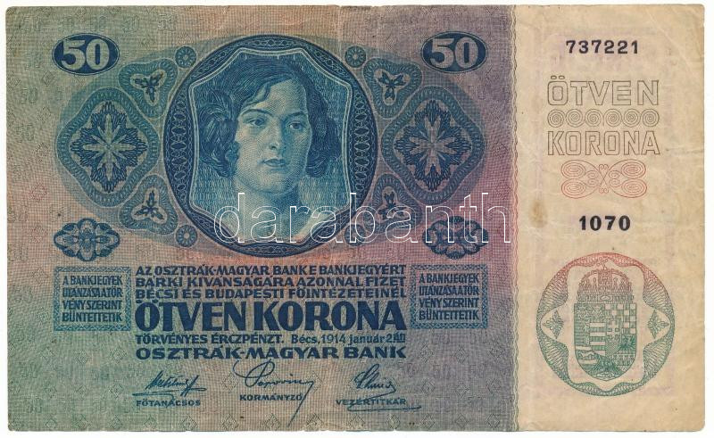 1914. 50K "1070 737221" felülbélyegzés nélkül T:F, kis szaka... https://www.darabanth.com/hu/488-Gyorsarveres/488.0/Numizmatika/Magyar-bankjegyek~500009/1914-50K-1070-737221-felulbelyegzes-nelkul-TF-kis-szakadasok3Cbr-3E-Adamo-K24~II3340211
